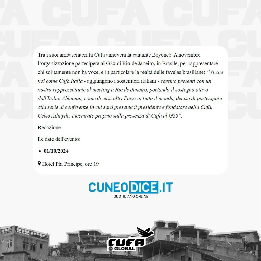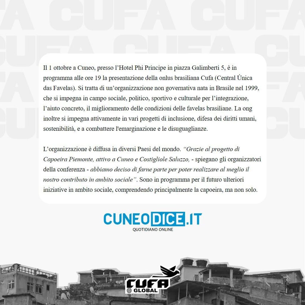 CUFA (Central Única das Favelas) was recently featured on the Cuneodice.it website in anticipation of its upcoming conference scheduled for October 1, 2024, at the Hotel Phi Principe in Cuneo, Italy, at 7 PM. This event will include the presence of Celso Athayde, president of CUFA, who will share his experiences and insights on the role of favelas in the global landscape.