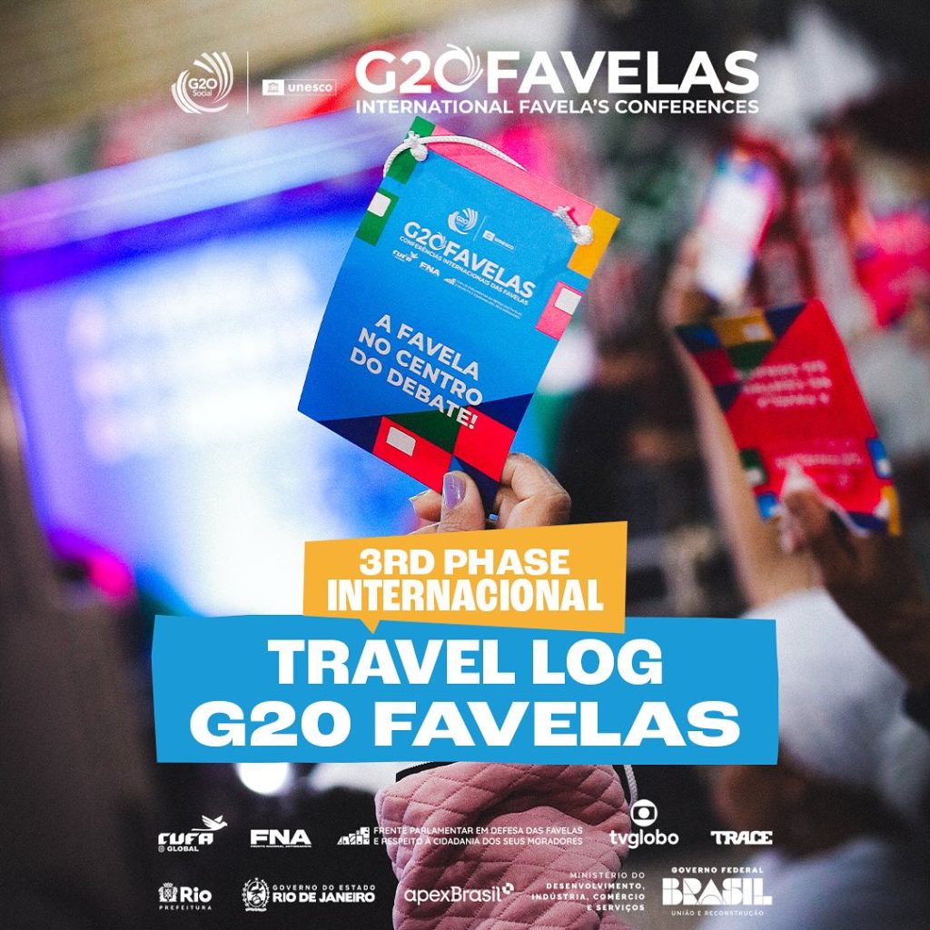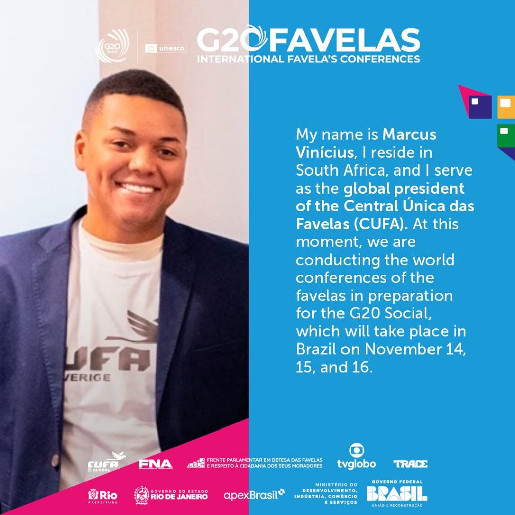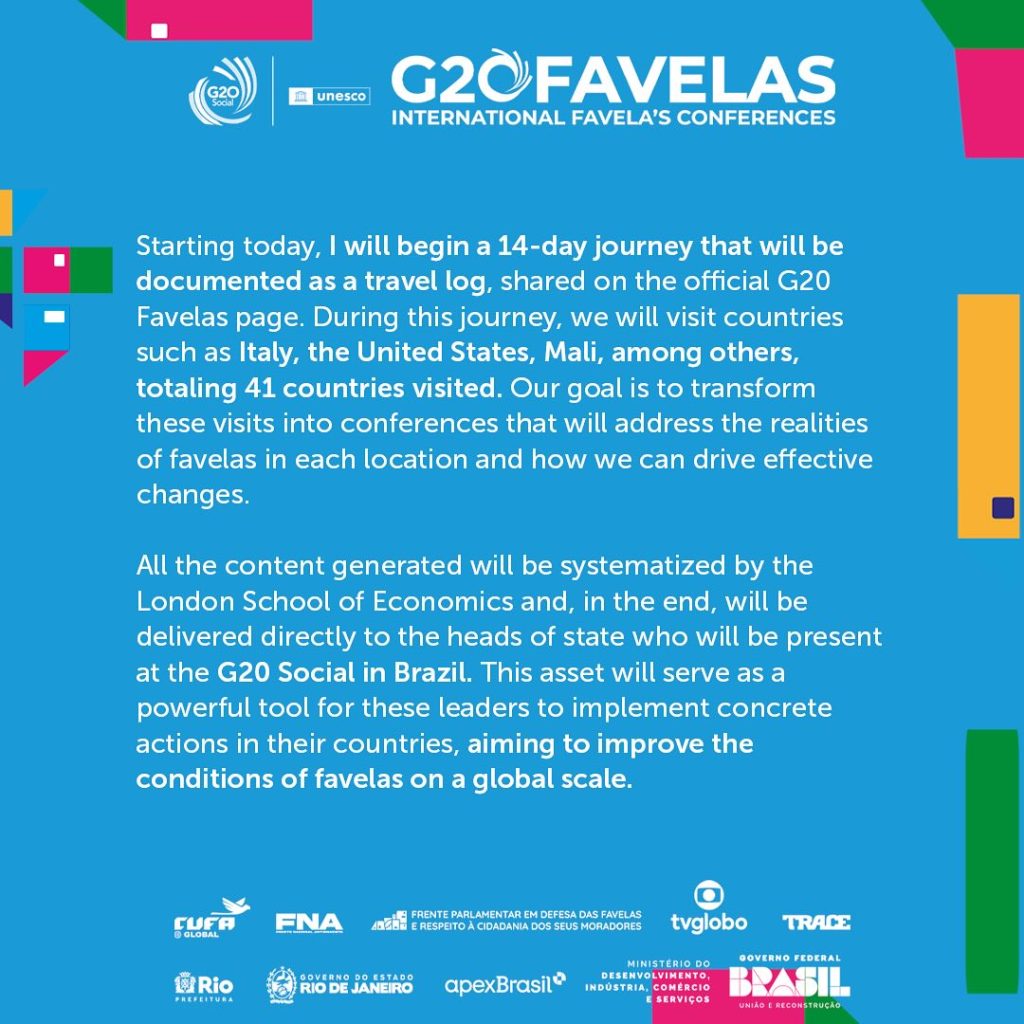 The president of CUFA Global, Marcus Vinícius, has embarked on a 14-day journey, which will be documented as a travel log. During this trip, he will visit countries such as Italy, the United States, and Mali, participating in the International Favelas Conferences, G20 Favelas! 🌍